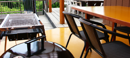 海が見えるウッドデッキでは、夕食・昼食のバーベキューが楽しめます。
