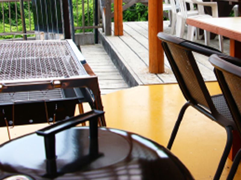 海が見えるウッドデッキでは、夕食・昼食のバーベキューが楽しめます。