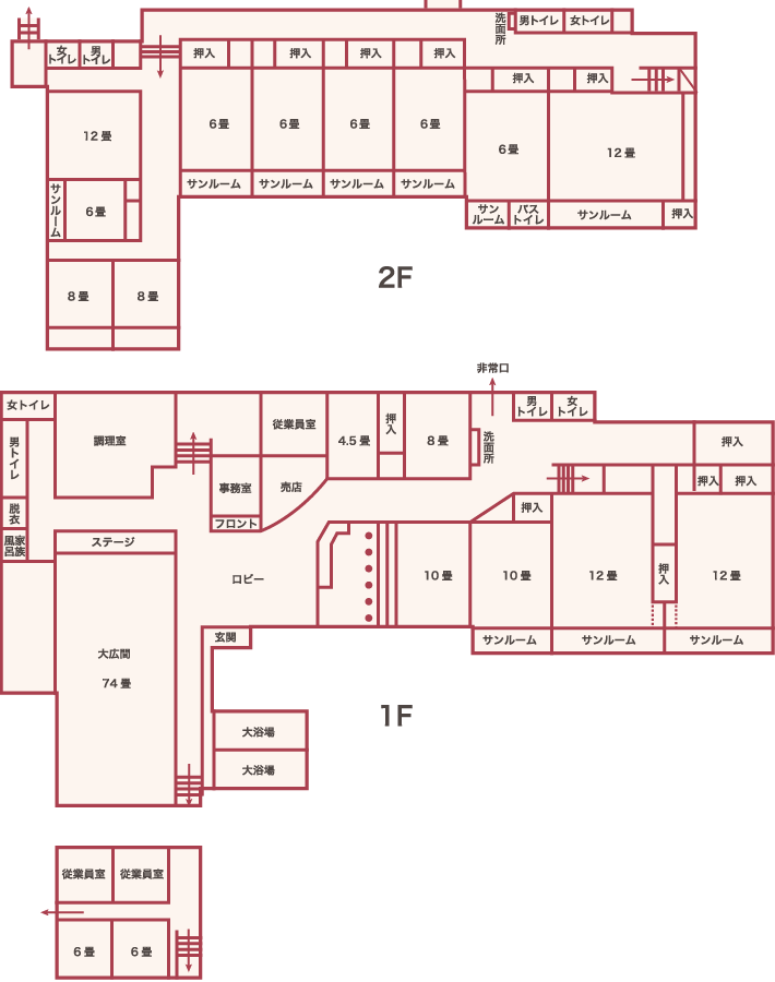 | 施設設備 | 総客室数12室(収容人数大人66名、小中学生90名)、大広間(70畳)、食事処、大浴場(男女各1)、家族風呂、駐車場(無料)、売店 |